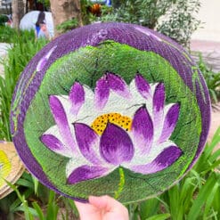 Sản phẩm làm từ cỏ bàng vàng, đan tay chắc chắn. Sen tím than vẽ tay bằng màu nước an toàn, phối sắc đậm nhạt tạo chiều sâu, từng cánh sen thể hiện sự mềm mại và nghệ thuật.