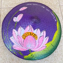 Nón được làm từ cỏ bàng vàng tự nhiên, bền nhẹ và thoáng mát. Sen xanh vẽ tay thể hiện bằng những nét cọ nhẹ nhàng, cánh sen xòe thanh thoát, màu sắc trong trẻo và thân thiện.